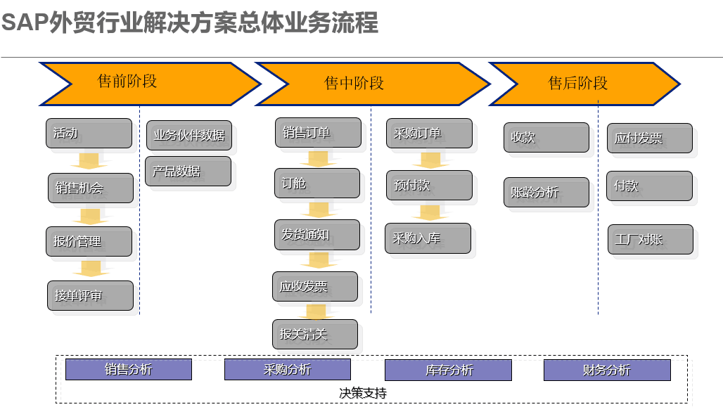 SAP ERP外貿(mào)行業(yè)軟件解決方案是針對外貿(mào)行業(yè)業(yè)務(wù)特征與信息化基礎(chǔ),為外貿(mào)企業(yè)量身定制。SAP ERP外貿(mào)行業(yè)軟件解決方案覆蓋了財務(wù)管理、銷售管理、訂單管理、采購管理、庫存管理、配船管理、單證管理、成本管理、客戶管理、樣品管理、質(zhì)量管理、毛利及經(jīng)營分析等外貿(mào)企業(yè)的諸多管理環(huán)節(jié),幫助您優(yōu)化業(yè)務(wù)流程,很大限度的節(jié)省成本,快速作出市場響應(yīng),保證企業(yè)在不斷變化的市場經(jīng)濟(jì)中持續(xù)的盈利能力。