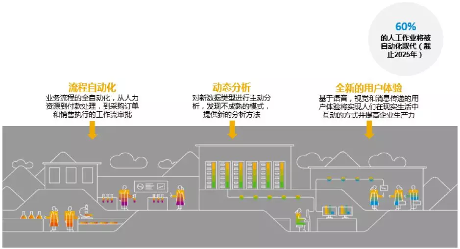 根據SAP公司及行業協會做的商業分析和預測,到2025年全球運營的現代化商業中,將有60%的人工作業將被自動化所取代,這些領域包括且不限于,制造業,銀行業,保險業,零售終端,倉儲配送等等。現代企業主要對業務流程自動化,企業數據動態分析,以及新的用戶體驗有著極高的需求和期待。