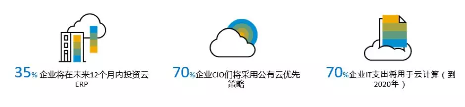 根據IDC咨詢公司2017年統計,未來一年內全球35%具有規模性的企業將開始投資云ERP,并且通過訪談和調研的形式得出結論,70%的企業CIO們會優先考慮公有云解決方案作為IT戰略規劃。預測截至到2020年,全球企業用于云計算的支出將占到IT總支出的70%。