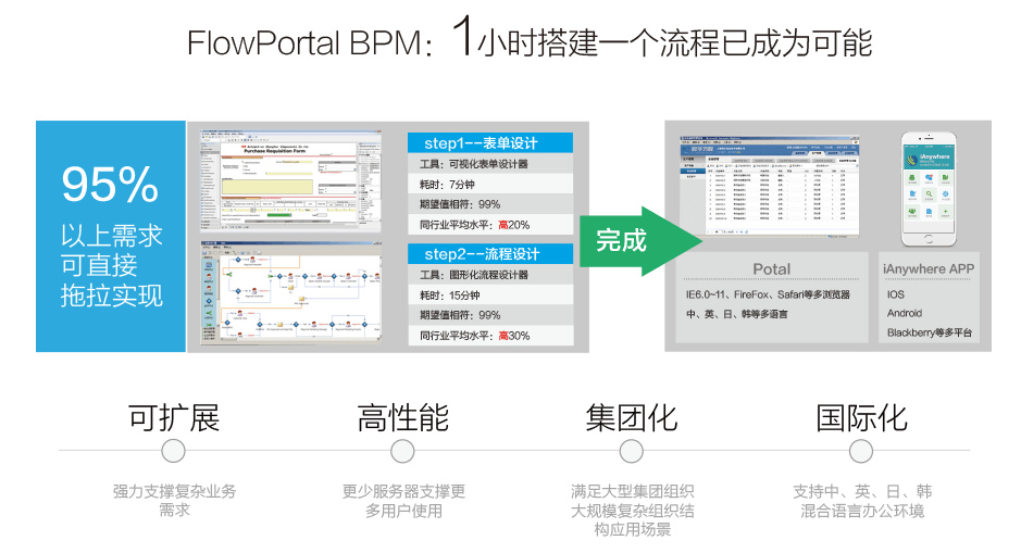 FlowPortal. net具有方便、易用和可擴(kuò)展的特性,一方面在FlowPortal. net中流程、表單、報表一切設(shè)計皆是可視化免編程的,另一方面FlowPortal. net采用微軟.net技術(shù)做為流程和表單的基礎(chǔ)技術(shù),具有良好的開放性、可擴(kuò)展性和彈性,是企業(yè)進(jìn)行業(yè)務(wù)流程管理的理想戰(zhàn)略平臺。